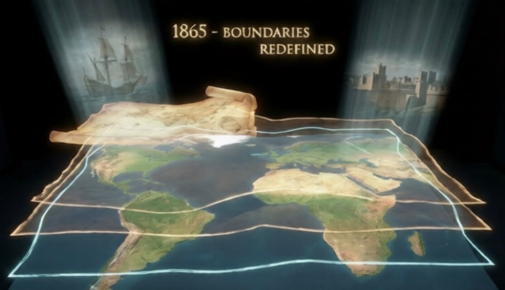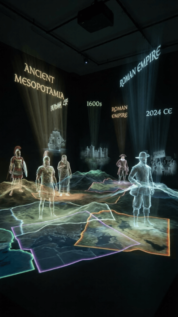 - Temporal markers: Dates (e.g., 1865, 1204, 1492) and labels (e.g., “ANCIENT MESOPOTAMIA,” “TERRA INCOGNITA”) anchor the narrative in historical context while floating freely in 3D space.