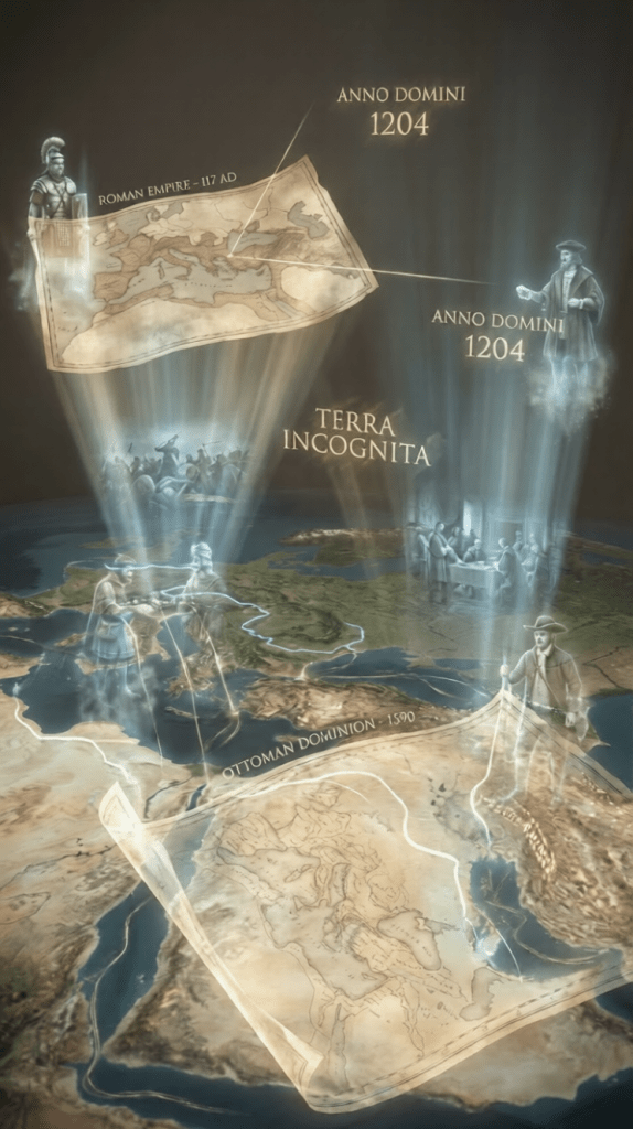 A Roman soldier stands beside a modern protester. An explorer’s compass spins as borders liquefy beneath his boots. Ships dissolve into arrows. The word “TERRA INCOGNITA” fractures into stardust.