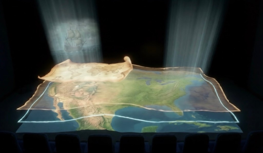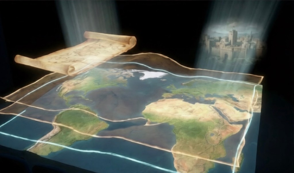 - Light projections: Beam-like rays illuminate floating maps and figures, creating a sense of archival discovery.