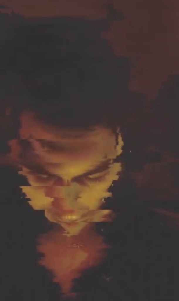 - Closing Segment (16–19 seconds): The video cuts back to low-quality live-action, mirroring the opening: the man in the dark shirt, now in a dim setting with faint blue and warm ambient lights. The final frame distorts into pixelated blocks, obscuring his face.