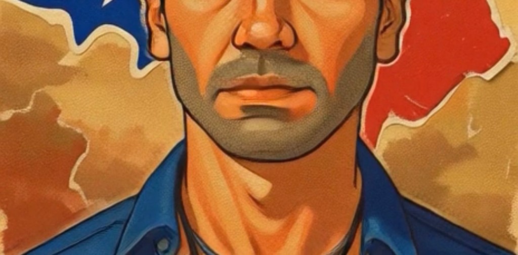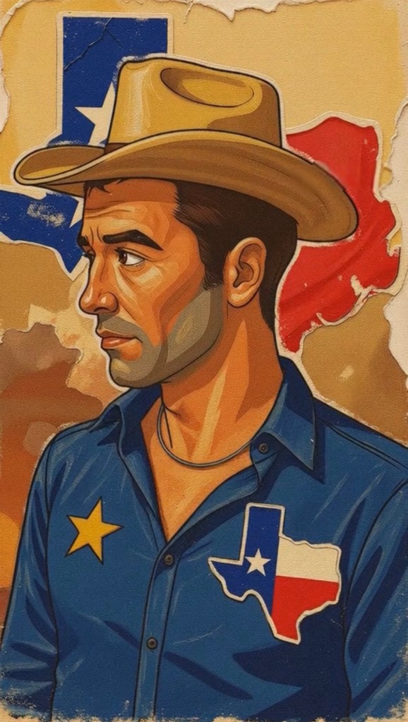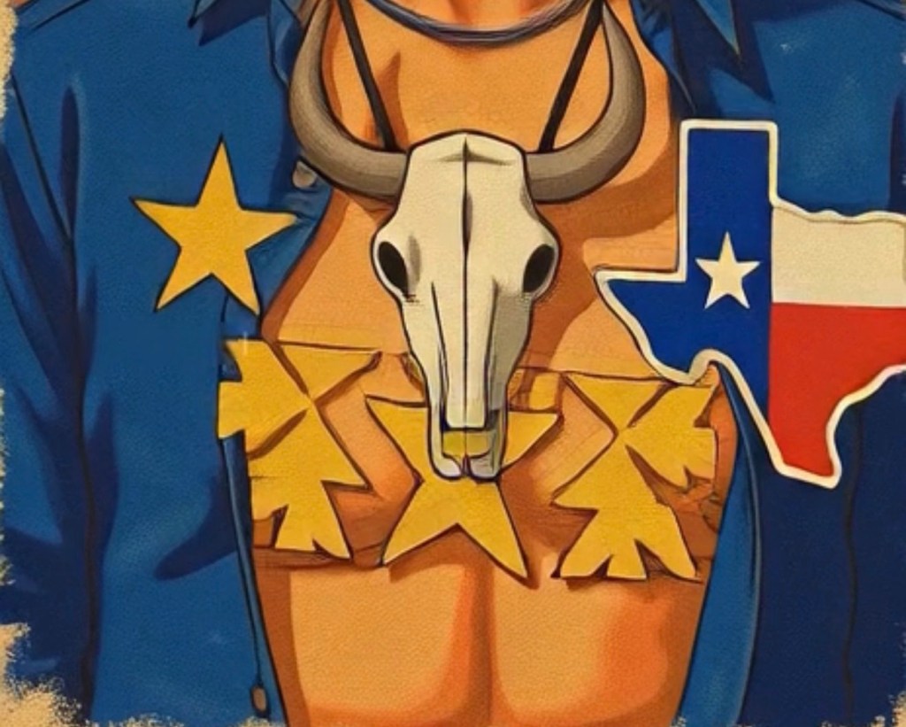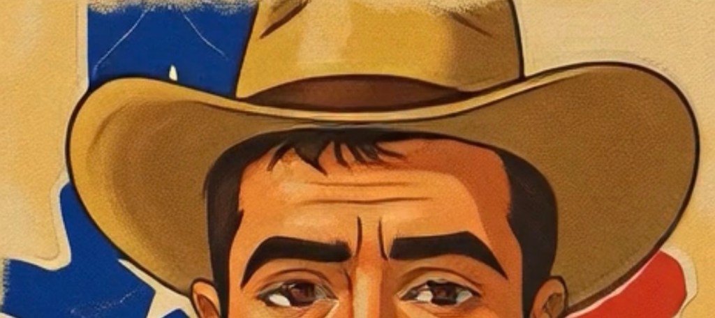 The animated transformation introduces a second visual plane. The same figure is reimagined as a Texan cowboy: tan hat, blue shirt with a yellow star patch, a Texas-shaped emblem in flag colors, and a steer skull pendant. The background fragments into stylized flag motifs and textured beige surfaces reminiscent of vintage Western posters. The shift from muted realism to bold illustration is abrupt—almost jarring. It is precisely this rupture that animates the work’s political and cultural charge.