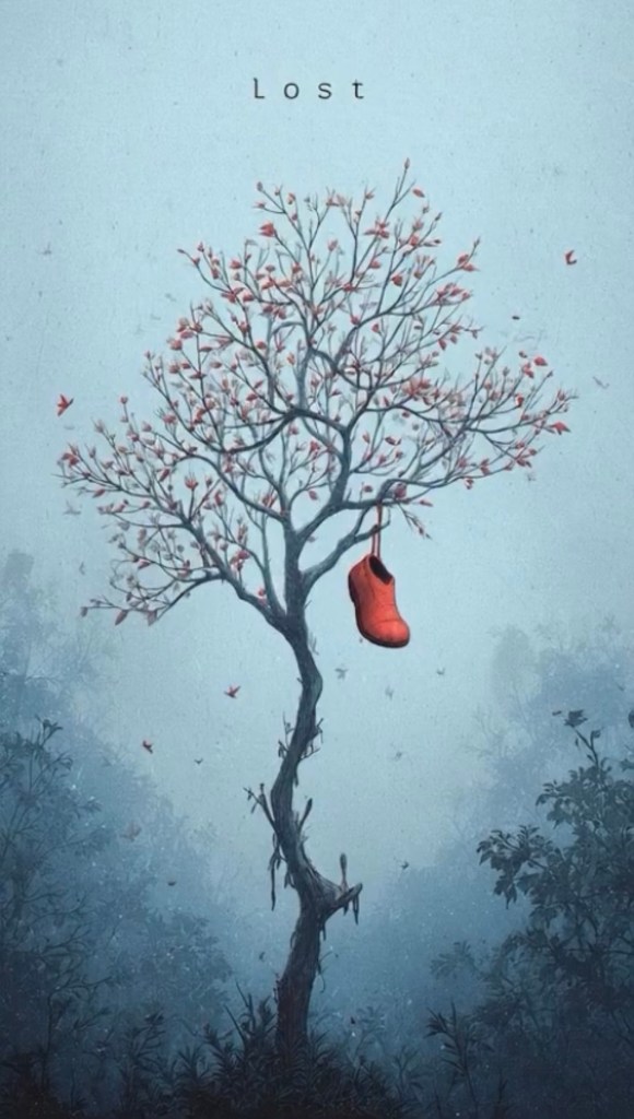 The slipper functions as a powerful symbol of human presence through absence. A shoe is an intimate object—it carries the imprint of a body, a journey, a direction. Detached from its wearer and hung unnaturally from a tree, it becomes evidence of interruption. The word “Lost” transforms it from a mere misplaced object into a narrative fragment. We are not simply witnessing a forgotten belonging; we are confronting the idea of disappearance—of a person, a childhood, a memory, or even a sense of self.