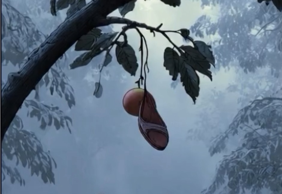 Farid Nazifi’s motion graphic presents a quiet yet haunting visual metaphor: a single slipper hanging from the branch of an apple tree, gently moving in the wind, with the word “Lost” written across it. Across different episodes, the imagery shifts slightly—sometimes the tree is blooming with delicate pink blossoms, sometimes it bears ripened apples, sometimes it stands in a mist-filled forest. Yet the central object remains constant: the suspended shoe.