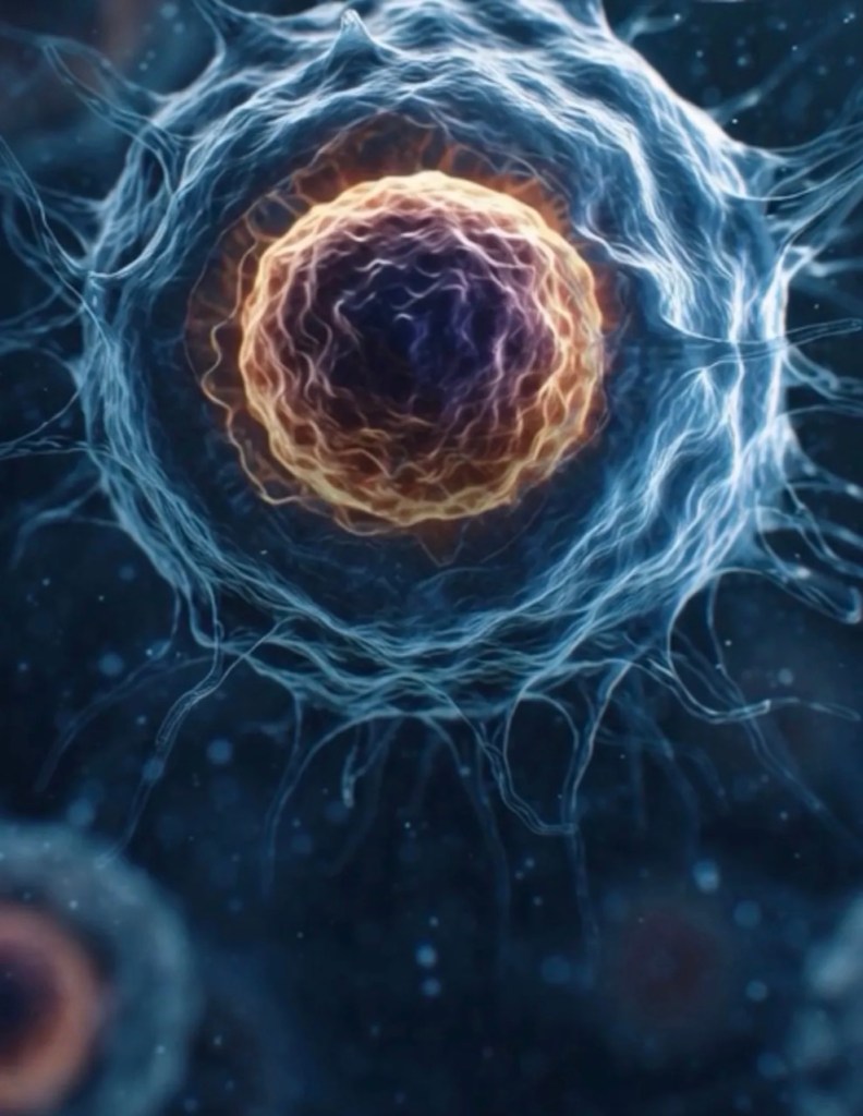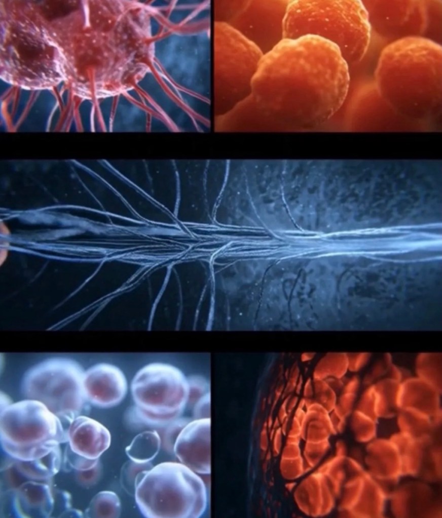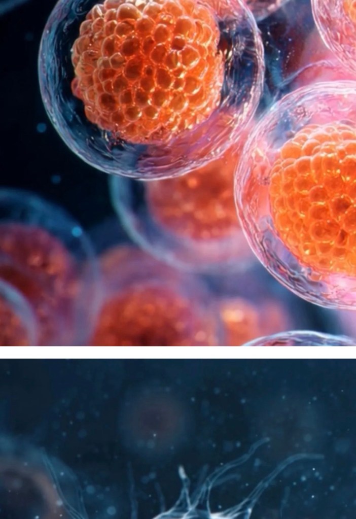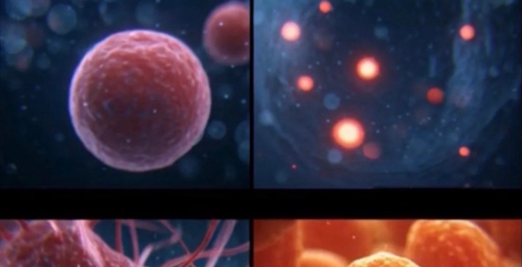 what stem cells might do. The imagery’s luminous cores suggest this speculative