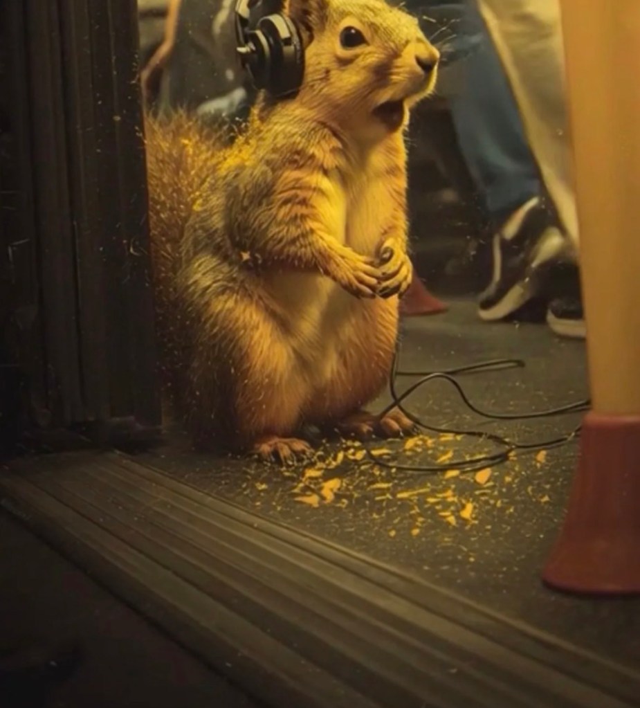 The squirrel functions as a proxy citizen — small, vulnerable, alert, and displaced. It