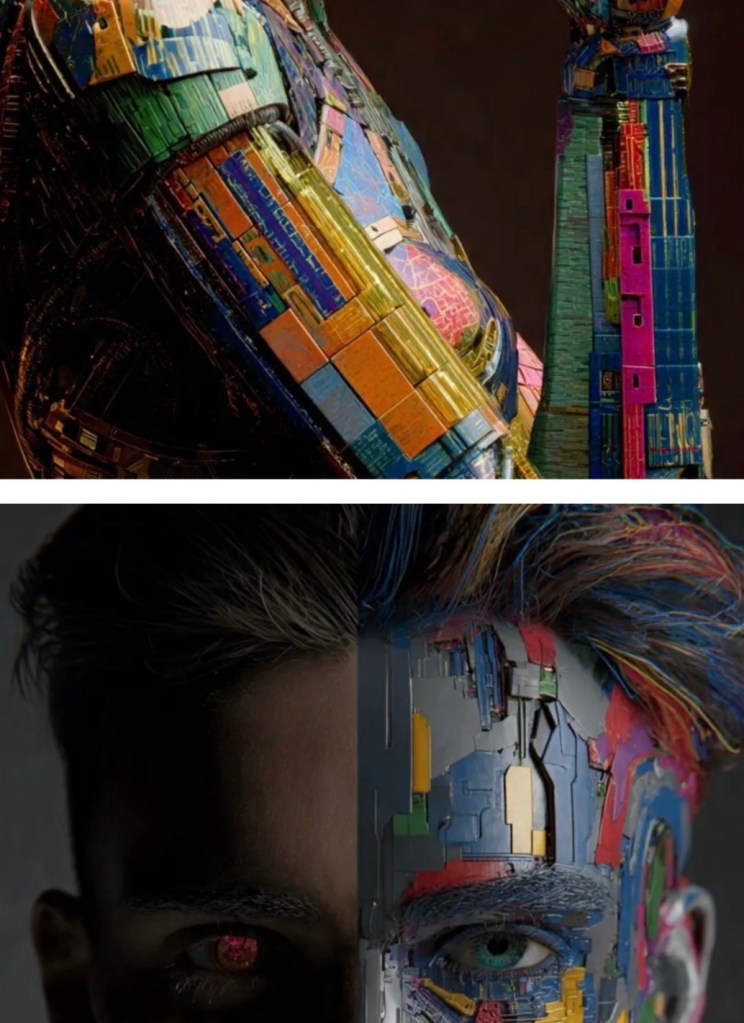 The fragmented, cybernetic bodies function as metaphors for societies under