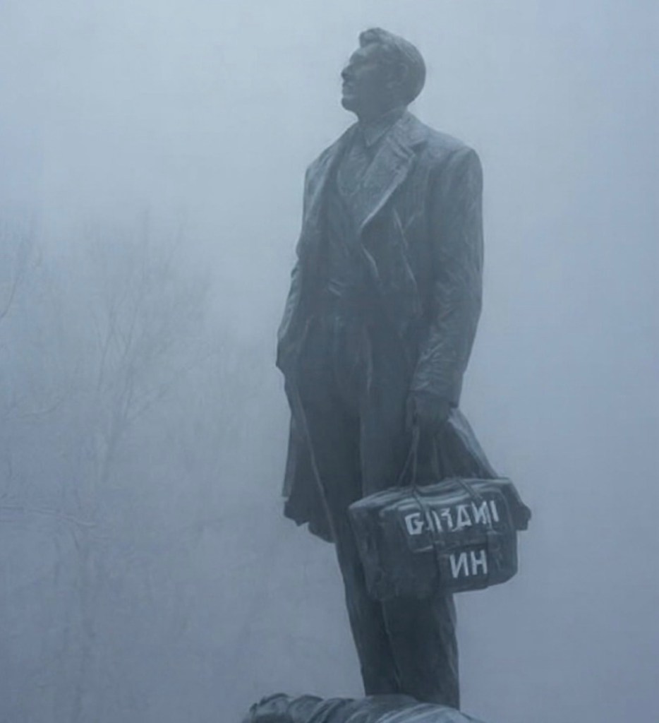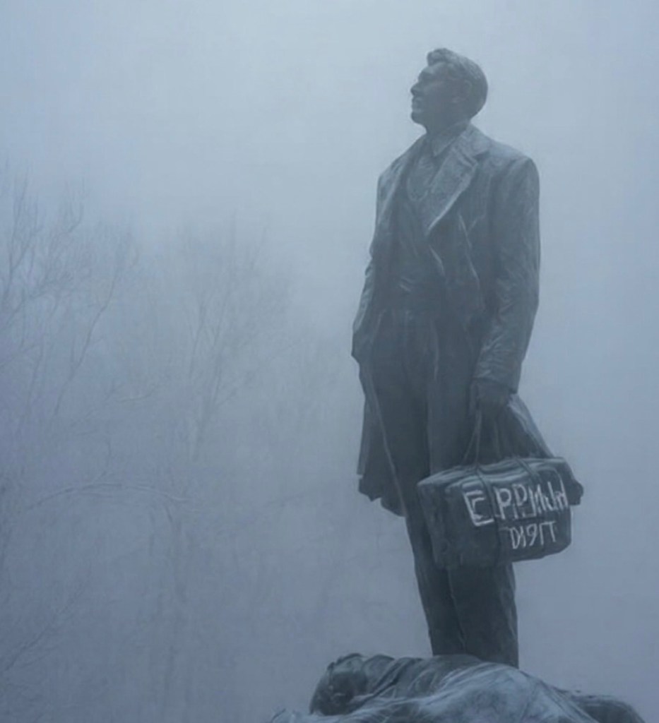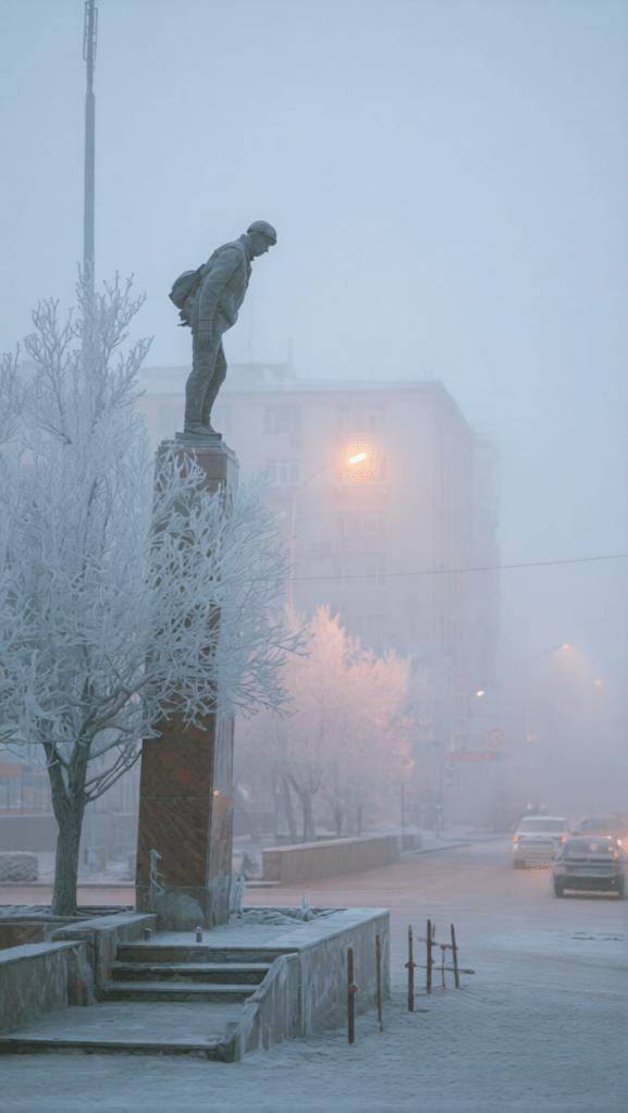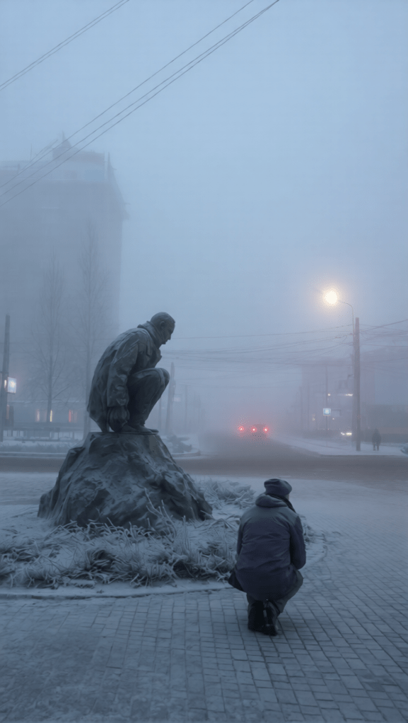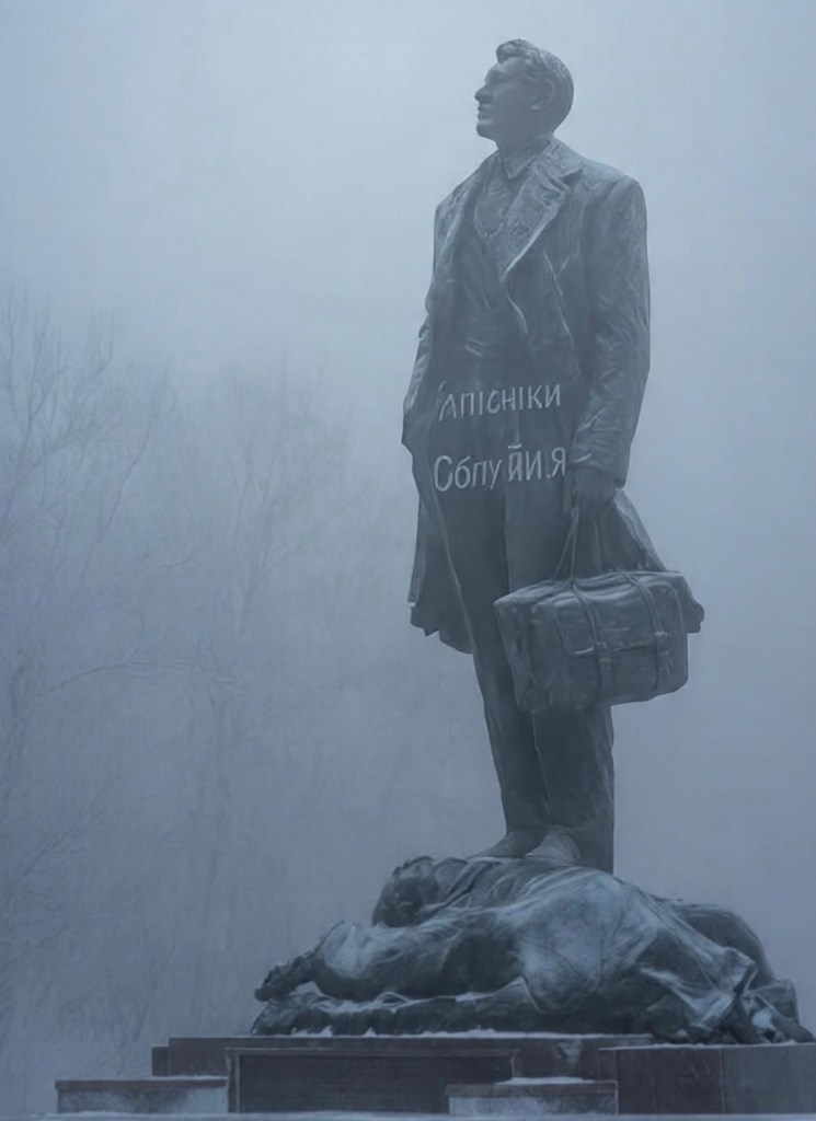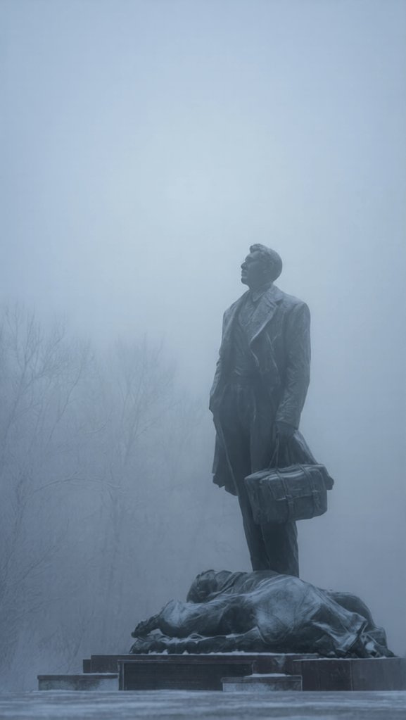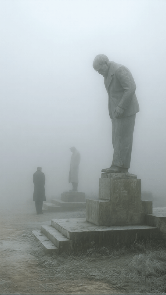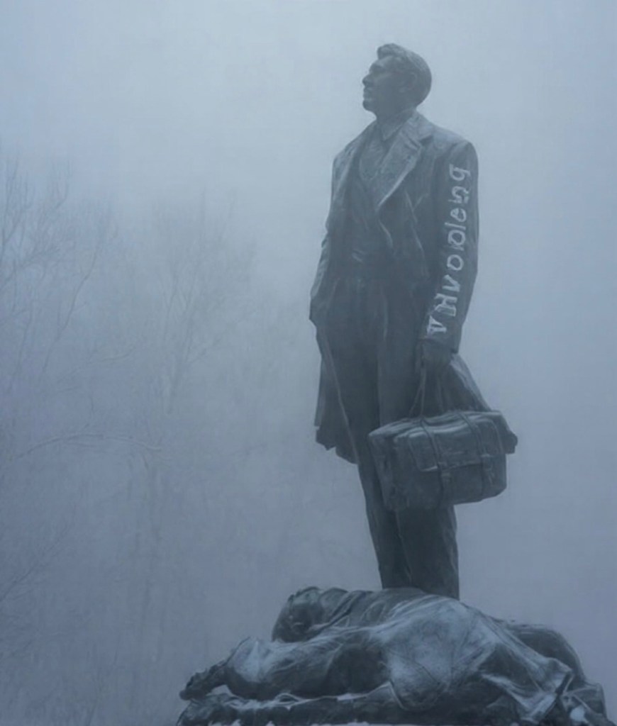 The fog dissolves geographical certainty, making the monument feel placeless and transnational. It could be Siberia, Europe, or a psychic interior landscape. This ambiguity mirrors the displacement of contemporary exiles: identities suspended between countries, languages, and futures. The muted blue-gray palette reinforces mourning but also endurance, as if the figure persists within a climate of repression and uncertainty.