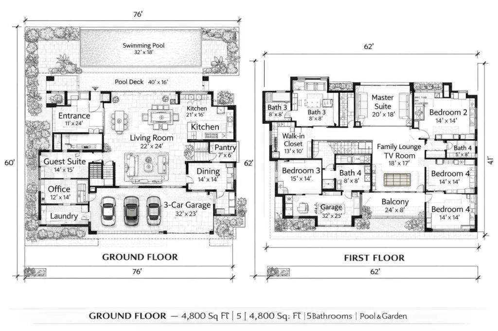 Front driveway Landscaped garden Swimming pool Pool deck and lounge area Outdoor dining terrace Balcony overlooking the backyard