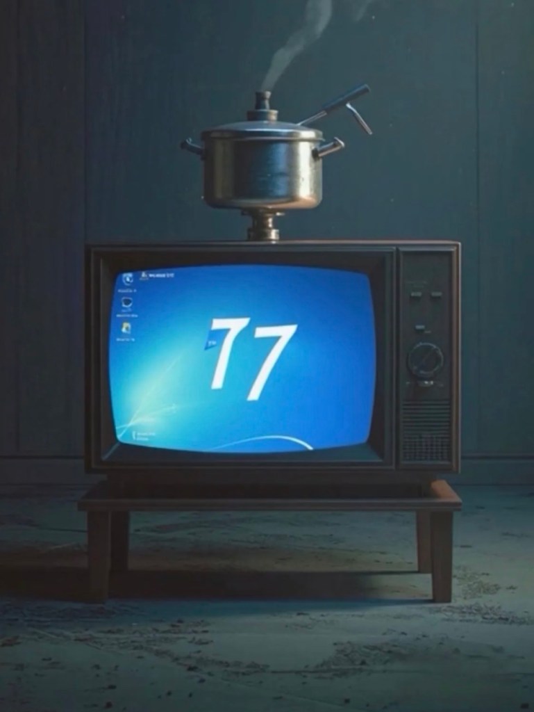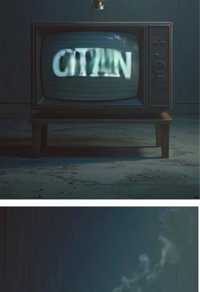 The muted color palette, retro television, and absence of faces reinforce a sense of
